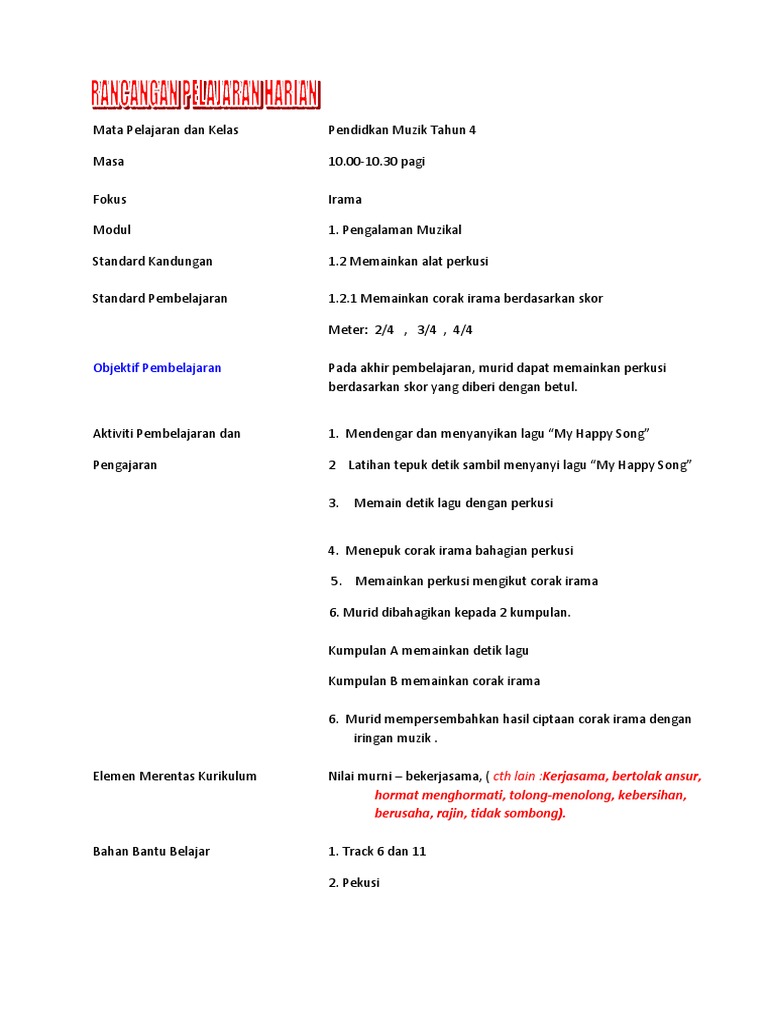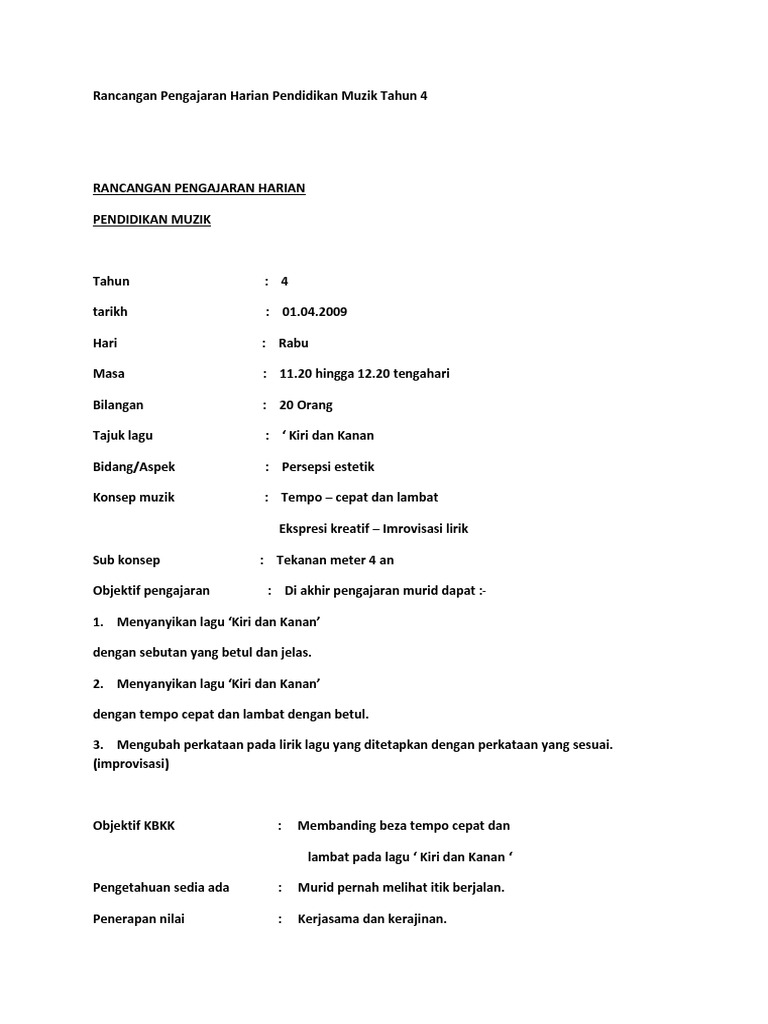 Rancangan Pengajaran Harian Pendidikan Muzik Tahun 4 Pdf